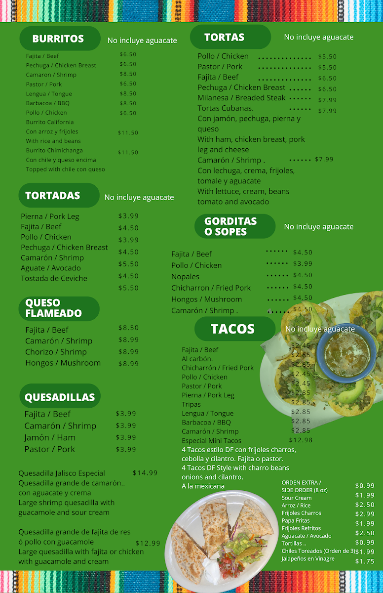 The Tacos section offers a variety of options such as Tacos al Carbón (charbroiled tacos), Tacos Pastor (marinated pork tacos), and Tacos de Fajita (fajita tacos), catering to all tastes. For something hearty, the Platillos (entrées) are packed with flavor, with dishes like Chicken Flautas, Mexican-Style Steak (Bistec a la Mexicana), and the signature Jalisco Plate.