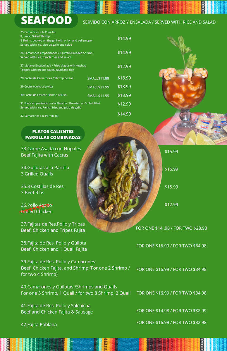 For those craving seafood, the Mariscos menu has delicious offerings such as Fried Tilapia (Mojarra Frita), Grilled Shrimp (Camarones a la Plancha), and the luxurious Deluxe Shrimp (Camarones de Lujo). The Caldos (broths), served on weekends, include hearty options like Menudo (beef tripe soup) and Caldo de Gallina (hen broth).
