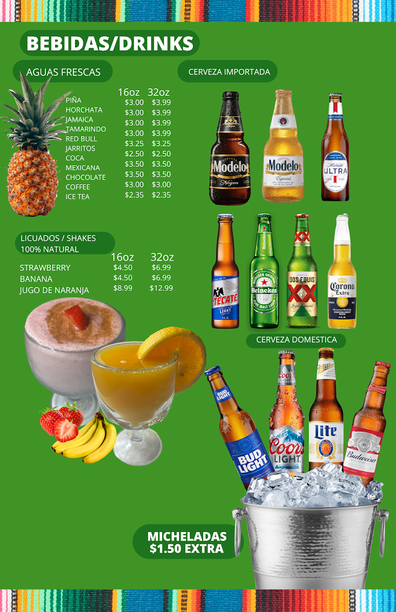 For dessert, the Tres Leches and Flan provide a sweet ending to your meal. Don’t forget to pair your meal with refreshing 100% Natural Shakes or traditional Aguas Frescas, with flavors like Pineapple (Piña) and Hibiscus Flower (Jamaica).